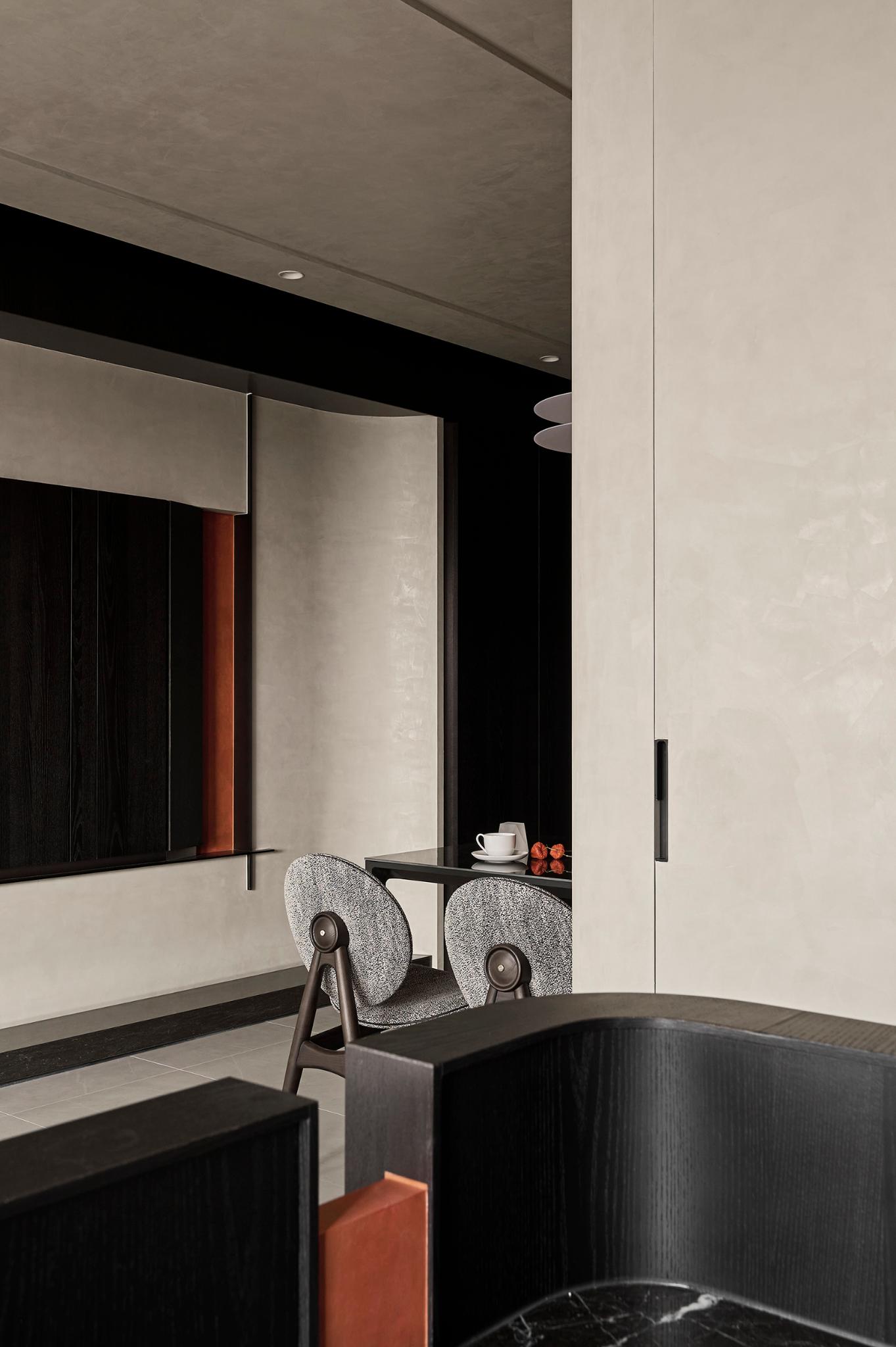 Inspired by the blend of ink wash aesthetics and a sunset. Using tranquil and subdued gray as the base tone, and incorporating coral orange into the space, the color scheme is vibrant yet serene, aiming to evoke varied ambiance transitions for the occupants. In such a tranquil and elegant space, people can sit down, forget about the hustle and bustle of the outside world, and engage in a dialogue with themselves, turning their home into a container that reflects their inner life.