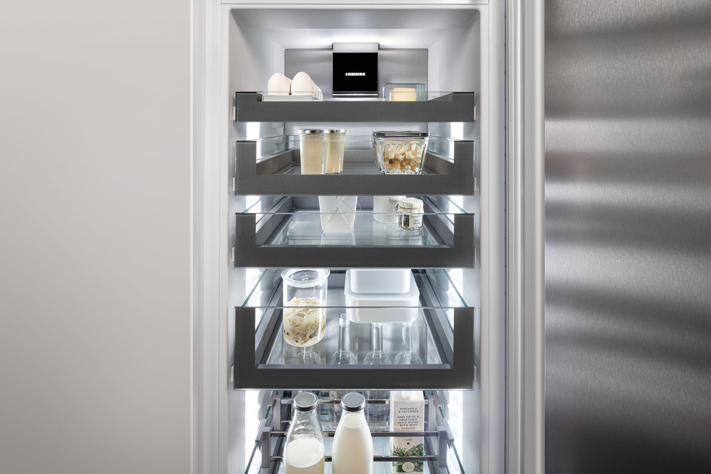 Liebherr-Hausgeräte GmbHLiebherr's new IRBPdi 5170 refrigerator with OpenStage drawers follows the principle of an apothecary cabinet. Large transparent glass drawers ensure a clear view of everything from bottom to top. The different heights of the drawers make it easy to store food of different sizes. In the bottom glass drawer, practical dividers ensure bottles are held securely in place. Handling is made even more convenient thanks to the self-closing mechanism with soft closing. BioFresh with HydroBreeze cools fruit and vegetables to the optimal temperature. The cold mist combined with a temperature around 0°C keeps fruit and vegetables fresh much longer.
