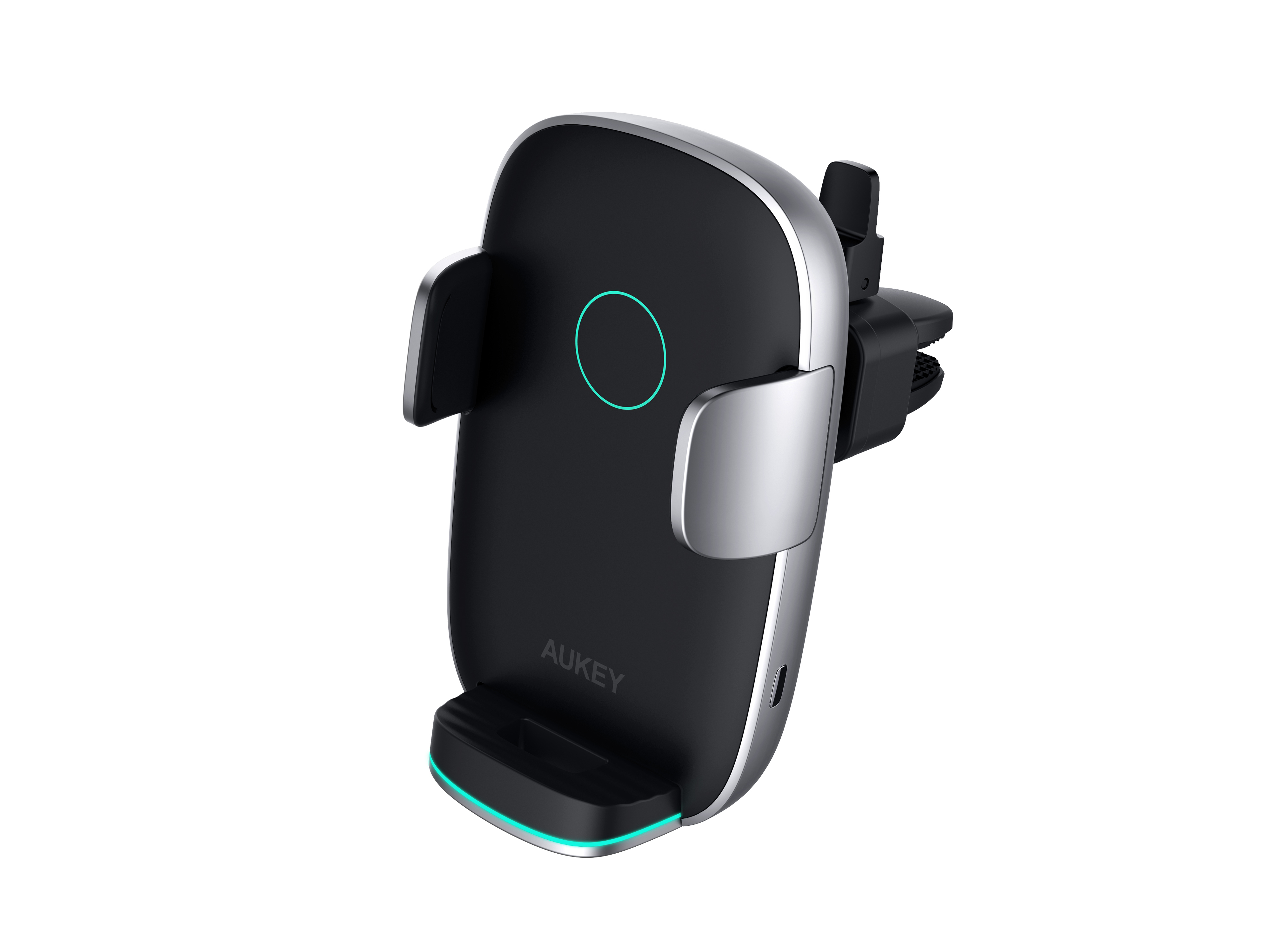 Aukey Technology Co., Ltd.Through sophisticated electromagnetic detection, this phone mount is able to sense when a device is placed in it and automatically clamps shut, grasping securely using curved arms. It will only close when an electronic device is placed on it, and not any other object. Once in place, the device is charged through Qi wireless charging. It comes with all the necessary safety features and protections, and the bottom ledge can be adjusted up and down to best position the device for wireless charging. Use of a supercapacitor means that, even when the ignition is off, the side-positioned touch-sensitive button is still able to open the clamp.