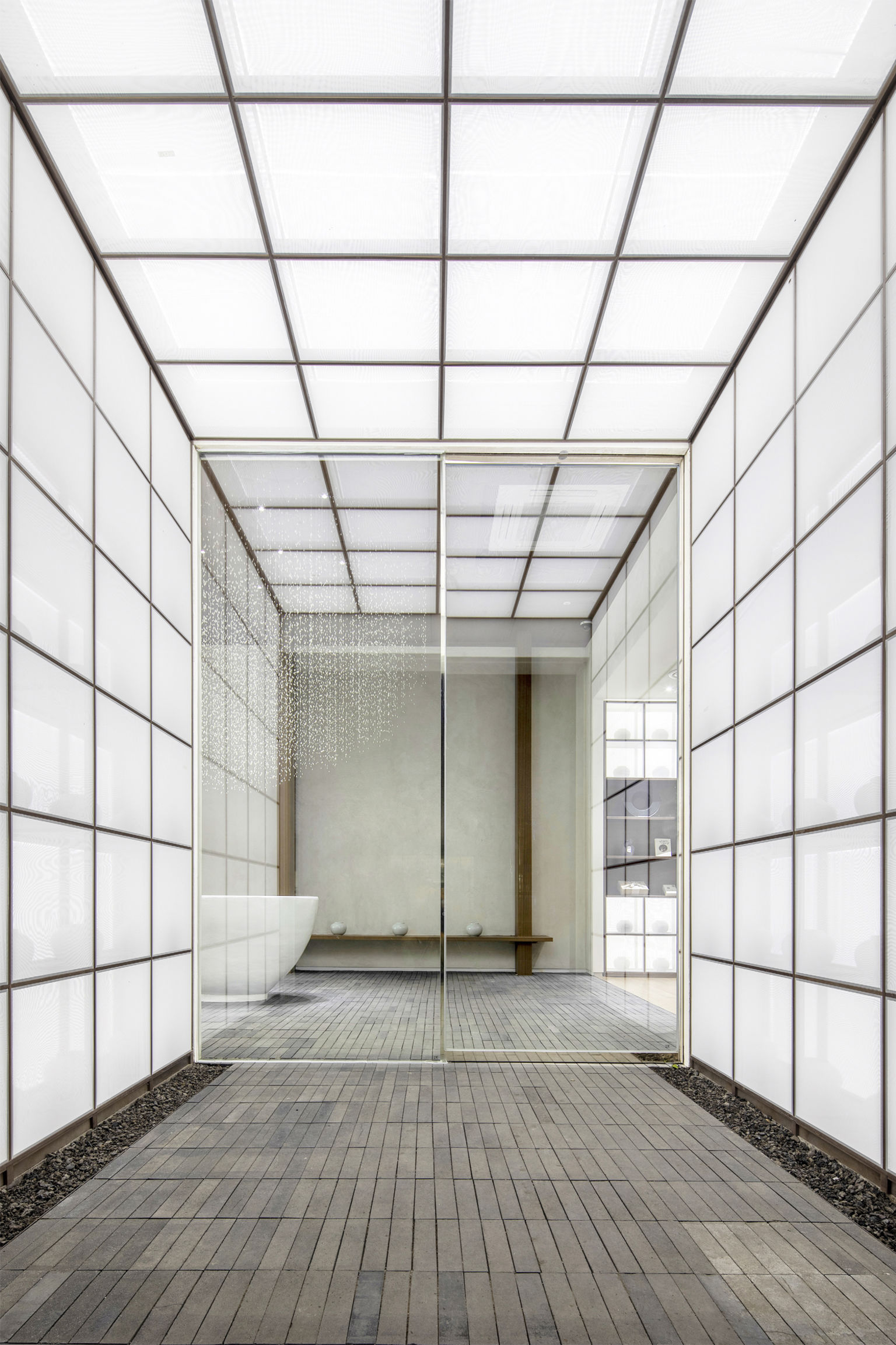 There is an aesthetic regarding the idea of “slowness” in Korean cuisine and dining. The restaurant interior pursues a natural and straightforward design through minimalism rather than lavish ornaments. You enter through a space dominated by a white ceramic piece by the artist Hyon Jung Lee; the white symbolizes infinite space. The installation above it is a shower of rice, which contributes to the richness of the dining experience.