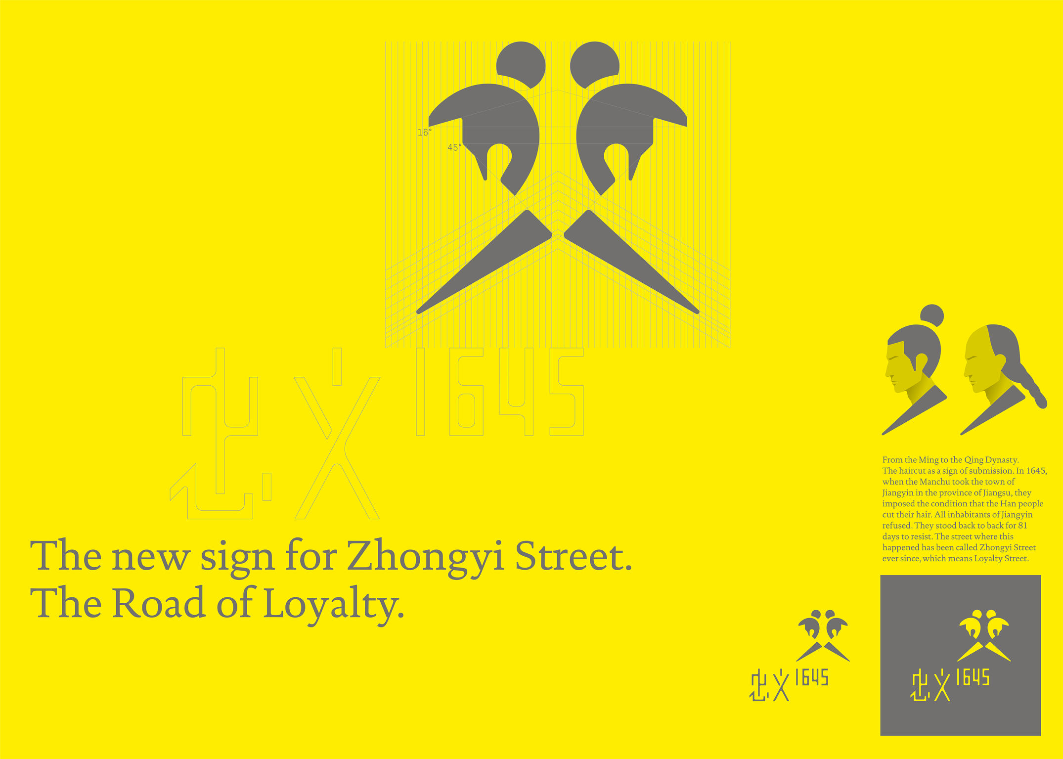 In 1645, the Manchu people from northeast China invaded Jiangyin in the province of Jiangsu, marking the end of the Ming Dynasty and the beginning of the Qing Dynasty. Upon entering Jiangyin, the conquerors required the Han people to cut their hair. Every inhabitant of Jiangyin refused. People stood back to back, protecting each other's hair for 81 days to resist. Ever since, the street where this occurred has been called Zhongyi or Loyalty Street. Now Jiangyin is planning to renew this area as a lively neighborhood for small shops and restaurants. The three posters document the cross-media branding for the revitalized district.