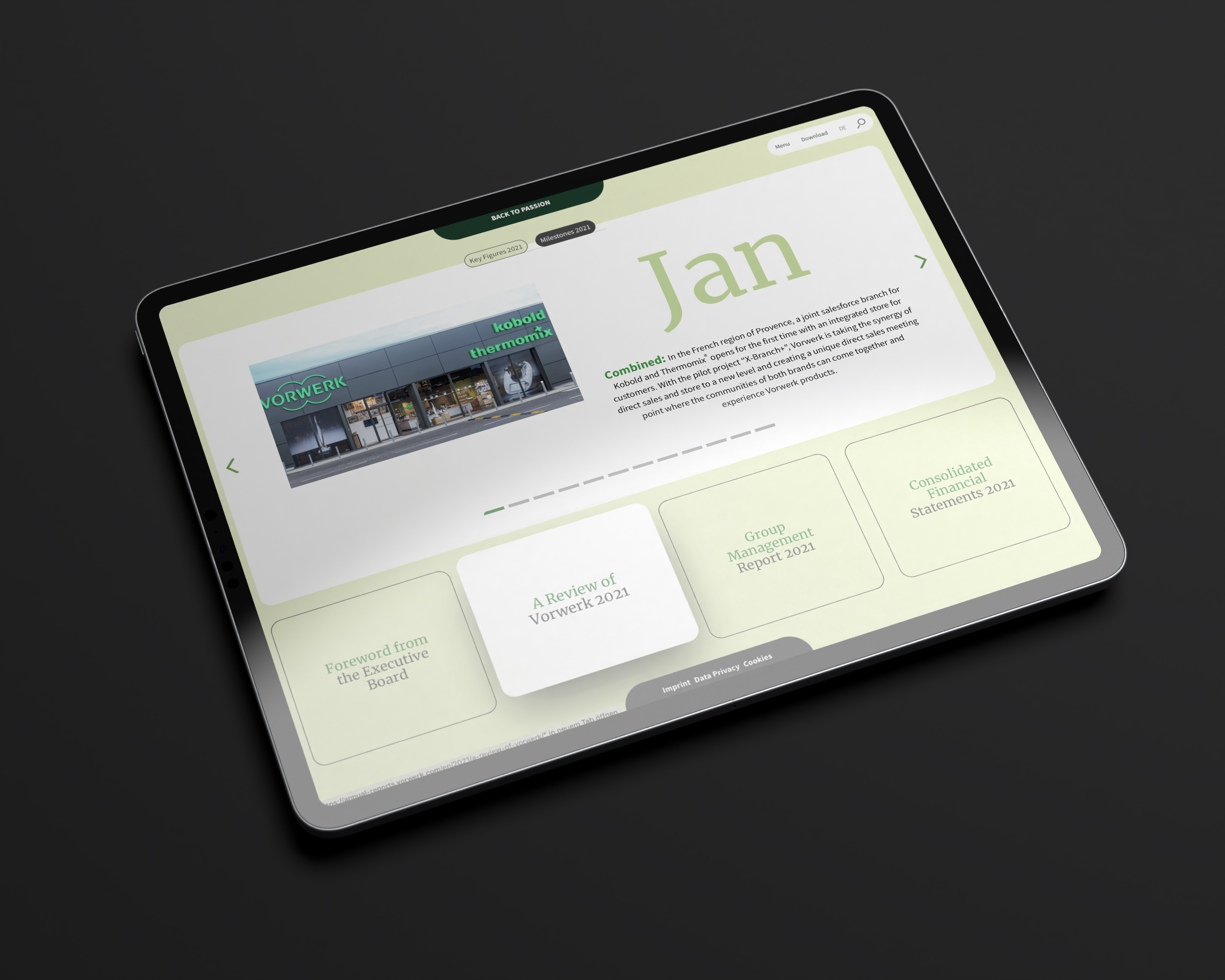 The annual report serves Vorwerk primarily as an image tool for the stakeholders from the press, employees and an interested public. The image section focuses on the topic of passion. Passion can be awakened suddenly by a very specific event or it can grow slowly and steadily. But it always has a trigger. The title of the report "passion:on" picks up on this emergence of passion. When it comes to passion, people are in the foreground. In short clips we want to track down the moment of magic. People from the Vorwerk cosmos talk about their passions and "passion: on" moments.