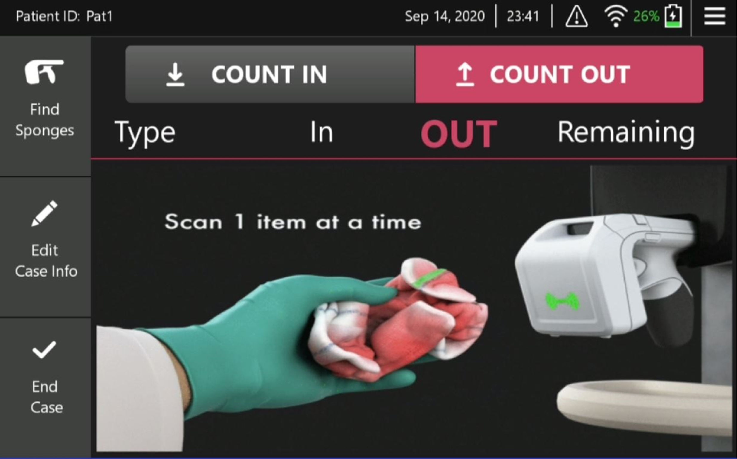 Stryker CorporationIn the United States, retained sponges are the No. 1 never event within surgical procedures, occurring over 4,000 times a year and costing over $600,000 per retained sponge in associated medical and legal expenses. SurgiCount+ is designed to improve workflow and prevent never events involving retained sponges. Each sponge has its own identifiable RFID that is scanned into and out of the surgical field. If a sponge is missing, the scanner can simply be removed from its holder and used as a tracker to find sponges within and outside of the patient anywhere within the operating room—essentially eliminating the risk of retained sponges.