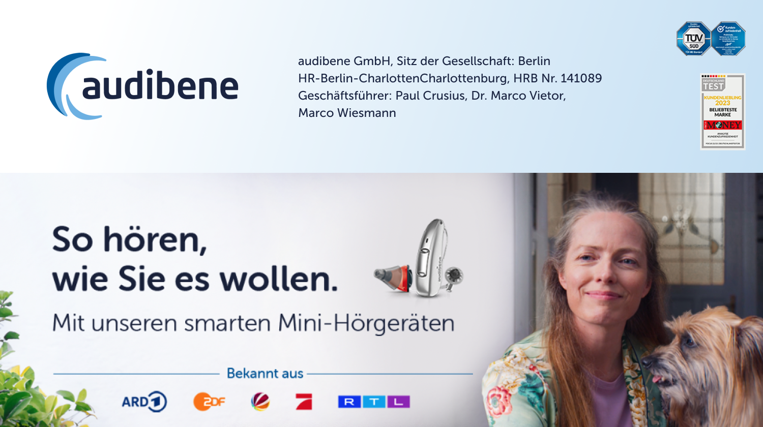 Desde su fundación en 2012, audibene / hear.com ha sido líder en innovación digital en el sector de los audífonos. En más de un millón de consultas con su grupo objetivo principal, especialmente exigente, los «Best Agers», audibene alcanza una tasa de satisfacción del cliente del 87 %, el doble que la media del sector. Este éxito ha impulsado un rápido crecimiento en ocho países de cuatro continentes. La empresa colabora con una red de 1300 audiólogos asociados en Alemania y 4500 en todo el mundo.